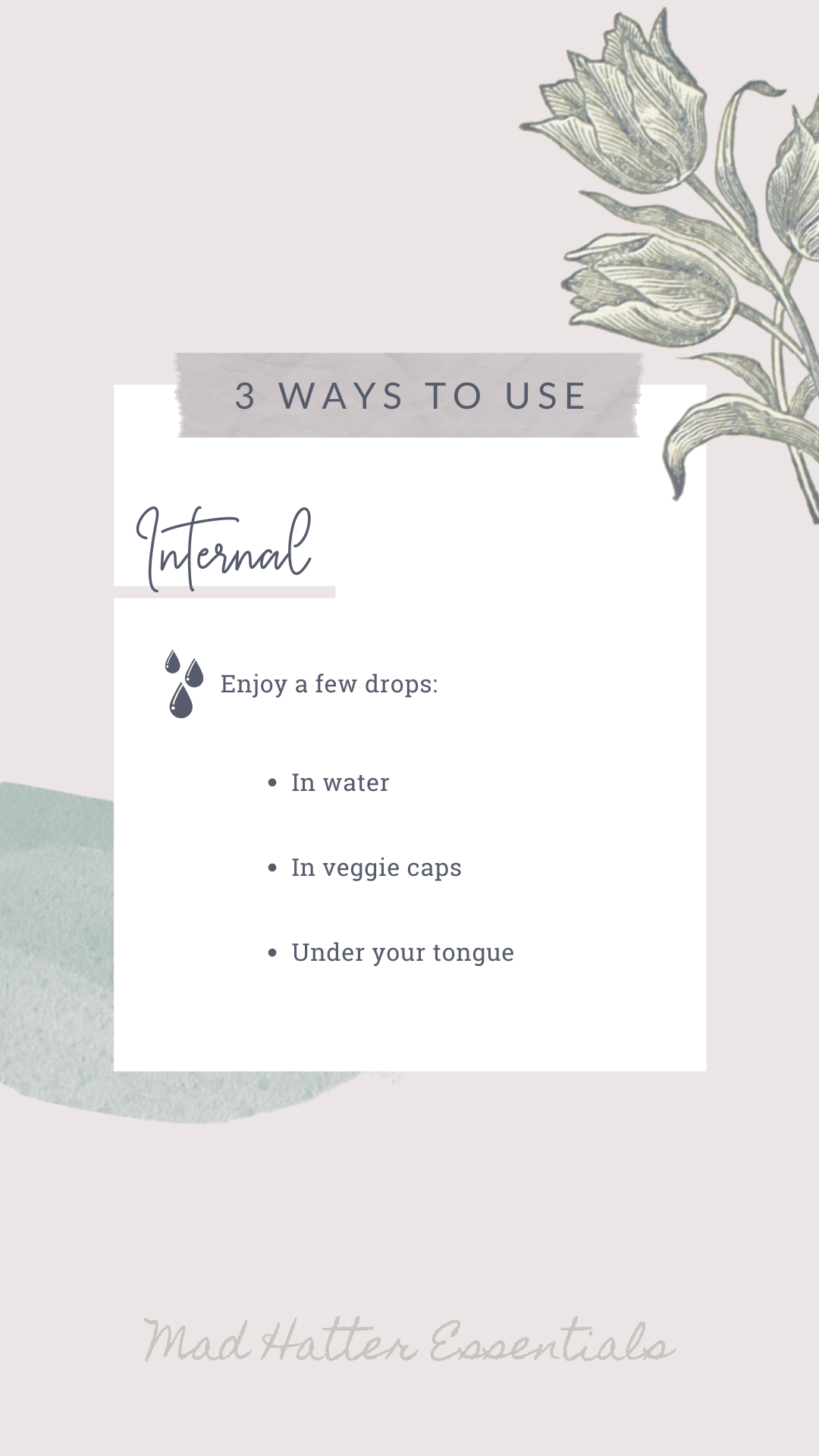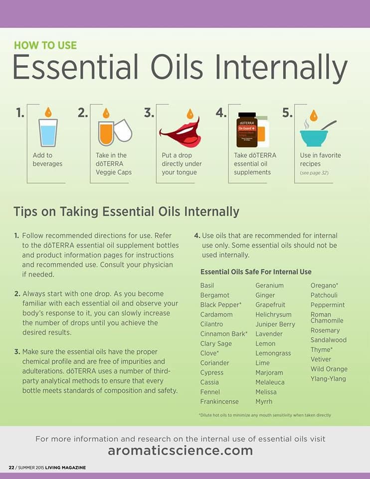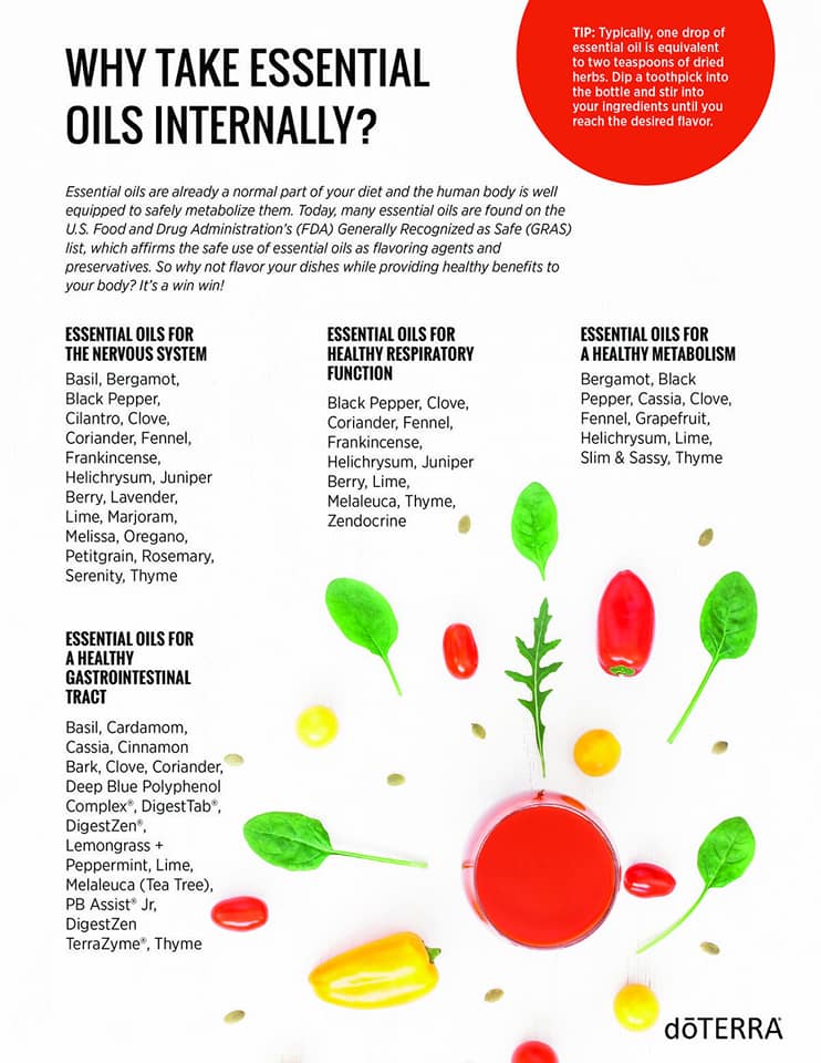 While many of our dōTERRA oils can provide several benefits when used internally, EDUCATION and SAFETY are of the up-most importance! ALWAYS follow the recommended directions for use. Refer to the dōTERRA essential oil supplement bottles (any dōTERRA oil safe for internal consumption will have “SUPPLEMENT FACTS” directly on the bottle, if there in no ‘Supplement Facts’ that oil is NOT recommended for internal use. STAY INFORMED!) Product information pages for instructions and recommended use are a great tool. Essential oils are incredibly powerful, less is always more. Start SLOWLY, listen to your body, and stay in contact with your physician when introducing new things into your daily regimen.