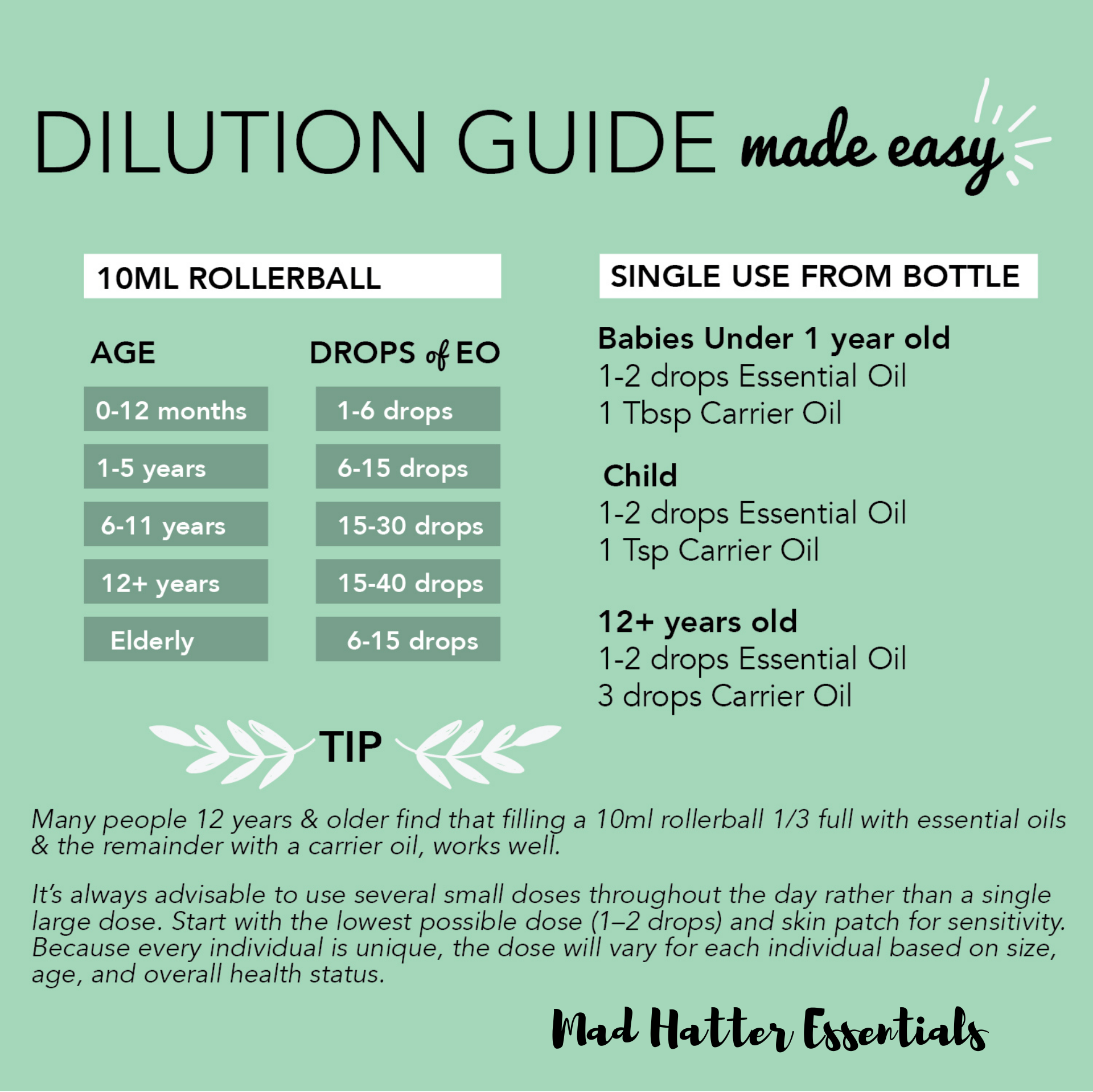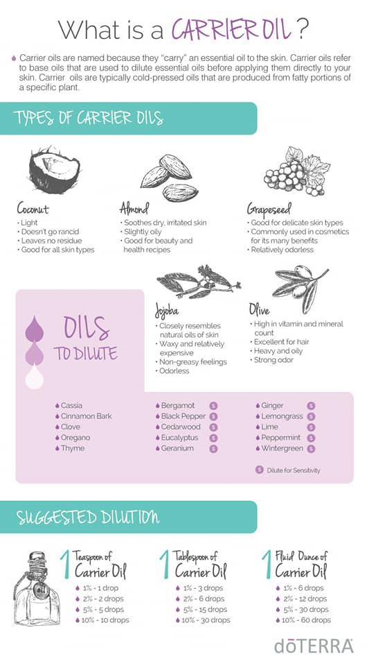 Dilution is one of our best friends with essential oils! Not only is it crucial when working with younger children, babies, elderly, or sensitive skin – but it also helps the oils work through the thick barriers of your skin to be able to get the most out of our topical applications! I highly suggesting finding a dilution chart you trust and love and save it to your phone for quick reference and stay educated about which oils you are using! dōTERRA is wonderful about informing us of “HOT” oils (can be sensitive to skin, should generally always be diluted) and “NEAT” oils (do not create as much of a sensitivity for direct topical application) – There are so many kinds of carrier oils, I prefer using fractionated coconut oil (stays in liquid form) – but many others work! Coconut, Almond, Grapeseed, Jojoba, Olive oils etc, or even an unscented lotion! Get in the habit of diluting for safe and effective topical use!