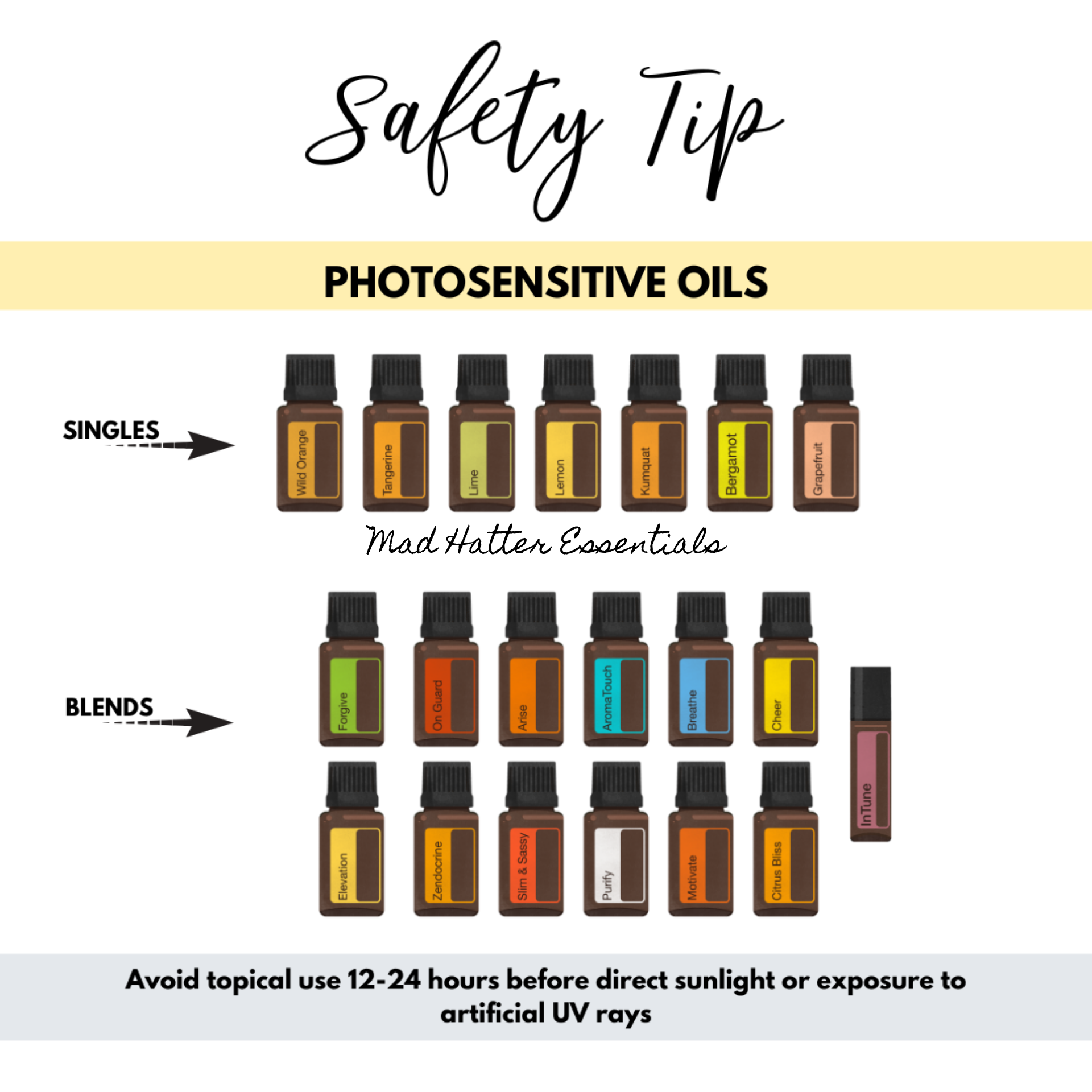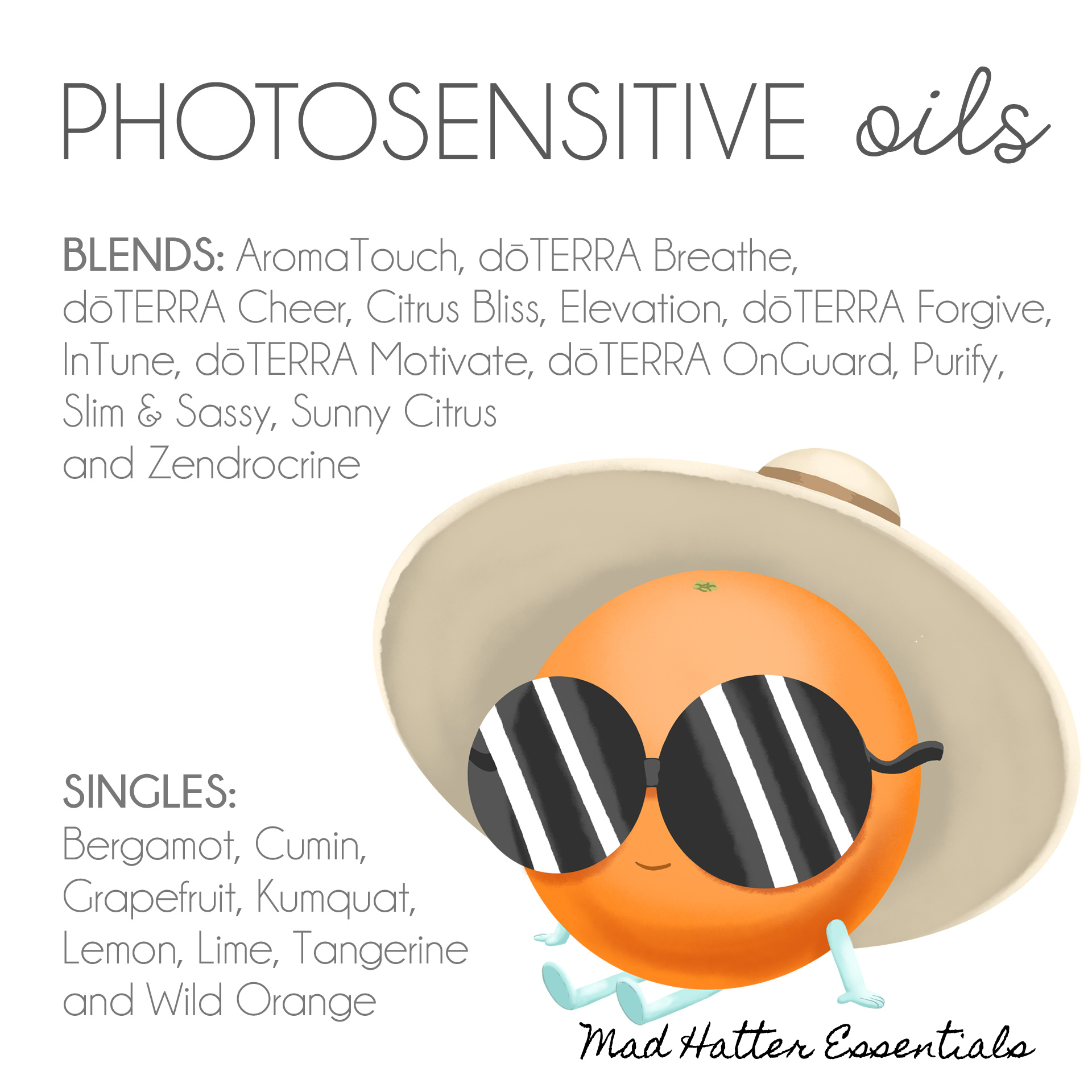 There are some of our essential oils that have a photosensitivity, mainly citrus oils, and therefore should be avoided wearing in the sun within 12 hours of application. Citrus oils have a rich taste and powerful health benefits – there are still plenty of ways to enjoy them through the summer months such as using topically in places that don’t spend much time in the direct sun (bottom of feet or underneath t-shirt) or in our water bottles. But be aware of those oils and oil blends when that sun decides to finally make it’s appearance this year!